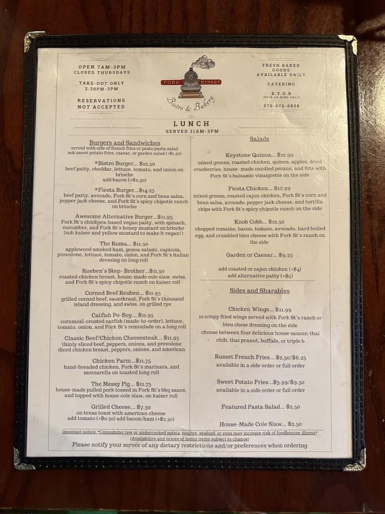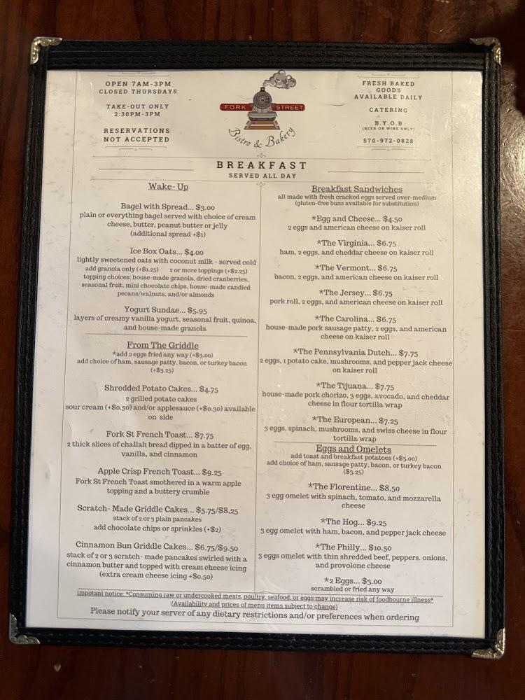 The menu at Fork Street Bistro and Bakery displays a thoughtful blend of casual dining and delectable baked goods. Breakfast offerings include classic favorites like breakfast sandwiches and rich pancakes, priced around $3 to $11. For a more substantial lunch, options like the Bistro Burger and Grilled Cheese are available at reasonable costs.